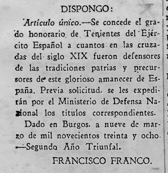 1936. urtean hasitako gerra zibileko garaileak hirugarren gerra karlistako galtzaile suertatutakoak izan baziren, gerra hori bukatu eta 62 urte beranduago, 1938ko martxoaren 12an, Francok bizirik ziren hemeretzigarren mendeko azken gerrako beterano karlistei bere ejertzitoko “Teniente Honorario” izendapena lortzeko aukera zabaltzen zien lege bat izenpetu zuen, erabaki hau gerra betean etorri zen, gerra bukatzeko urtebete baino gehiago falta zenean.