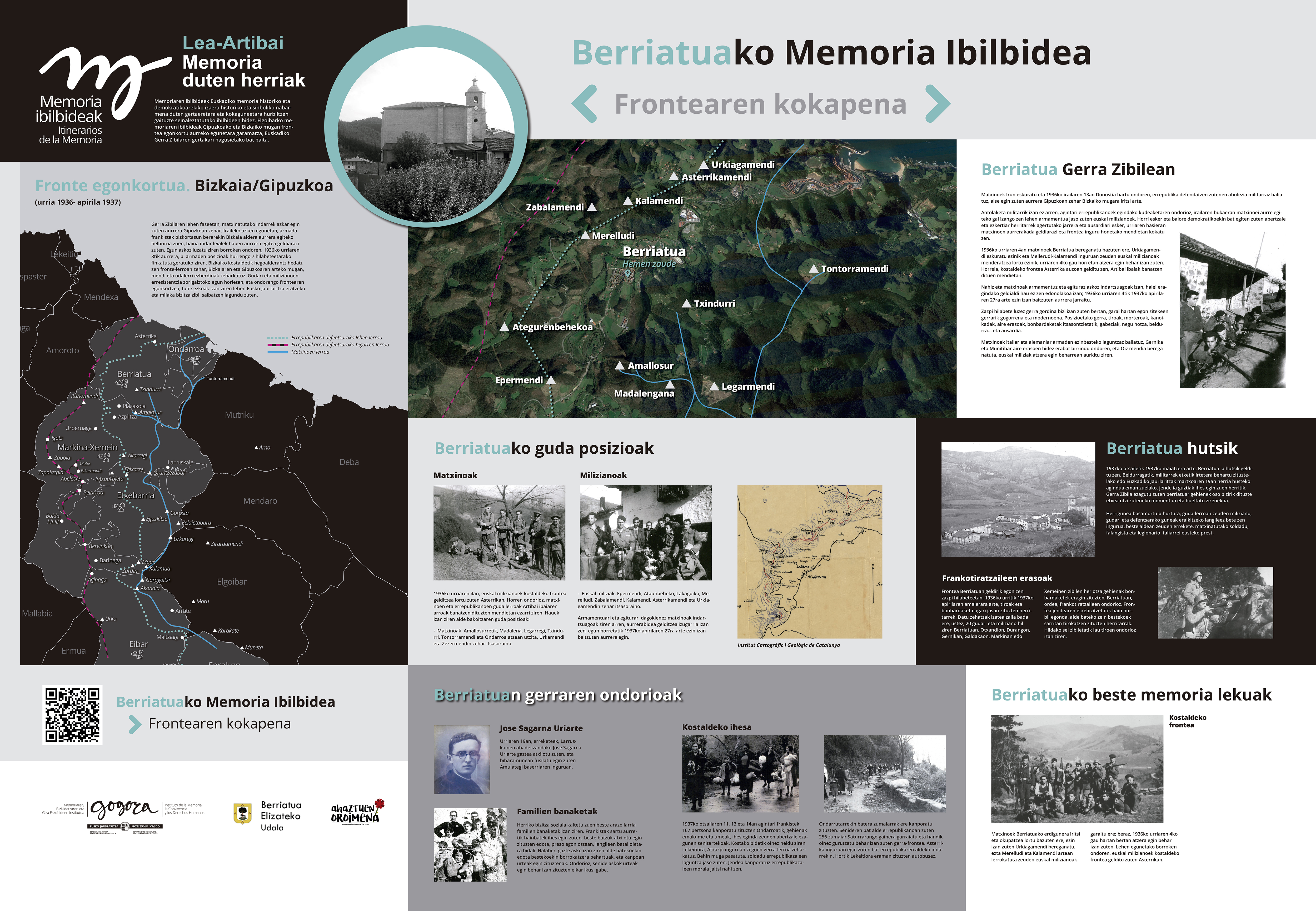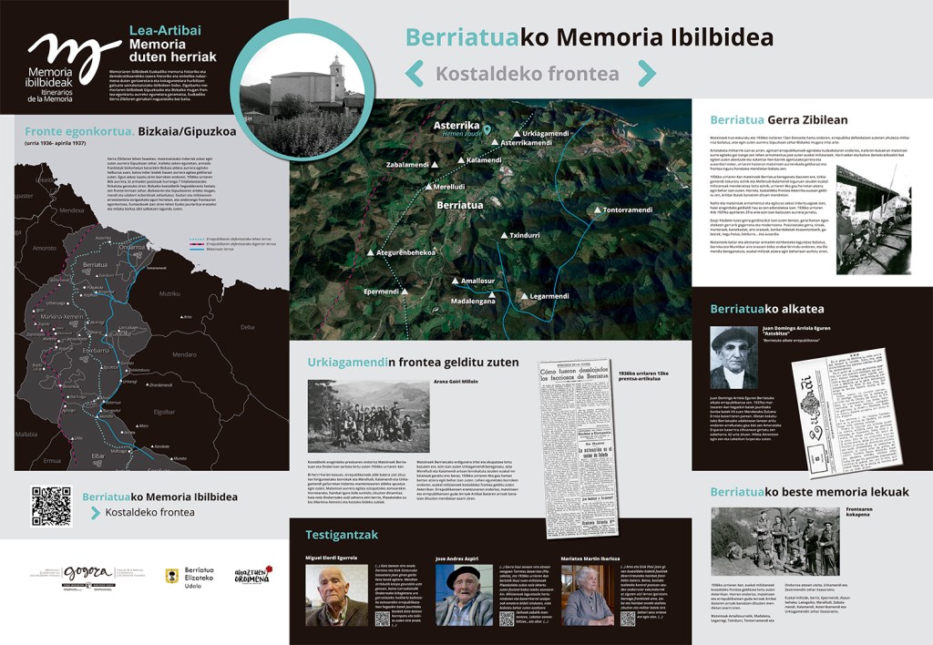 «Lea-Artibai, memoria duten herriak» jasotzen ditu, Memoriaren Ibilbideak ekimaren barruan, lehen lerroko gerra frontea hartzen duten herrietarako sortu diren informazio guneak. Gogorak (Memoriaren, Bizikidetzaren eta Giza Eskubideen Institutua) babestu eta Etxebarria, Markina-Xemein edo Berriatuako udalen ekimenarekin bat eginez, hainbat panel edo gune osatu ditugu. Berriatuan, bi gune jarri berri dira, horietako lehena, herrian bertan, herriko gertaera nagusiak jaso eta laburbiltzen dituena; bestea, Asterrikan, mendi edo lehen lerroko kokapenekin lotura zuzenagoa izango duena. Duela gutxi, Etxebarrian kokatutakoak aurkeztu genituen, hona hemen Berriatuakoak eta laister izango dituzue ikusgain Markina-Xemeingoak.»Lea-Artibai, memoria duten herriak jasotzen ditu, Memoriaren ibilbideak ekimaren barruan, lehen lerroko gerra frontea hartzen duten herrietarako sortu diren informazio guneak. Gogorak (Memoriaren, Bizikidetzaren eta Giza Eskubideen Institutua) babestu eta Etxebarria, Markina-Xemein edo Berriatuako udalen ekimenarekin bat eginez, hainbat panel edo gune osatu ditugu. Berriatuan, bi gune jarri berri dira, horietako lehena, herrian bertan, herriko gertaera nagusiak jaso eta laburbiltzen dituena eta bestea, Asterrikan, mendi edo lehen lerroko kokapenekin lotura zuzenagoa izango duena. Duela gutxi, Etxebarrian kokatutakoak aurkeztu genituen, hona hemen Berriatuakoak eta laister izango dituzue ikusgain Markina-Xemeingoak.