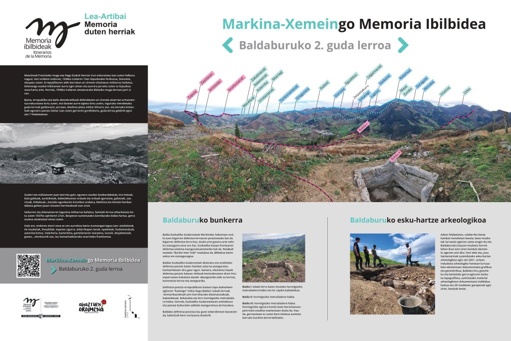 - Baldaburuko Bunkerra: Panel panoramiko honek, Zapolatik Urkora arteko begirada jasotzen du eta ondorioz, mendebaldetik hegoaldera arteko arkuan kokatutako gerra posizioak identifikatu eta kokatzen gune lagungarria. Gainera, gune hau MX-3 Iturreta. Baldaburuko bigarren guda lerroko memoria ibilbidean sartua dago non, azken eskuhartze honekin, ibilbidea seinalatzen duten hainbat geziz osatu dugun.