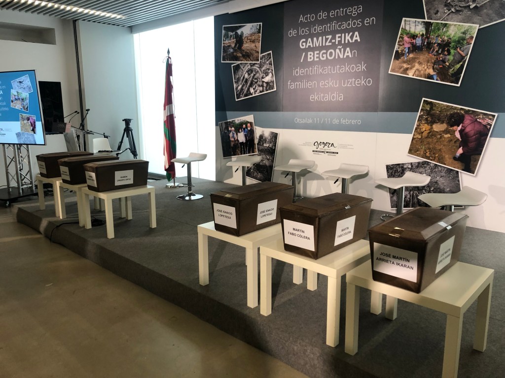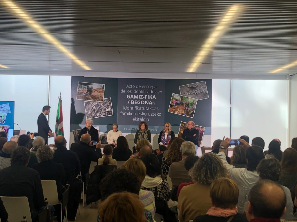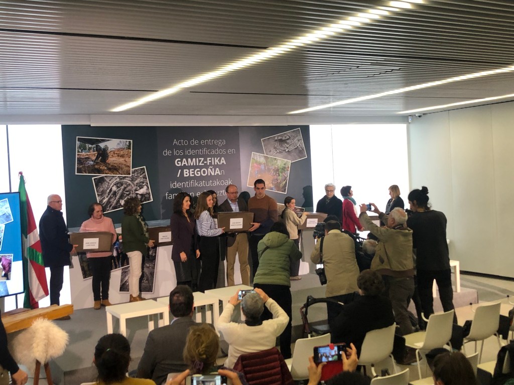 Bilbon, Gogora Memoriaren, Bizikidetzaren eta Giza Eskubideen Institutuaren egoitzan egin den ekitaldian izan gara. Patxi Jaka Bikandi (Amorebieta-Etxano, Bizkaia), Jose Martin Arrieta Ikaran (Markina-Xemein, Bizkaia), Martín Fabo Colera (Martzila, Nafarroa), Ramón Crespo Ortiz (Lanestosa, Bizkaia), Fernando Lahera Urrutia (Sopuerta, Bizkaia), Inazio Lopetegi Oliden (Zumaia, Gipuzkoa), gudari eta milizianoen gorpuzkinak senideenganatzeko ekitaldian.