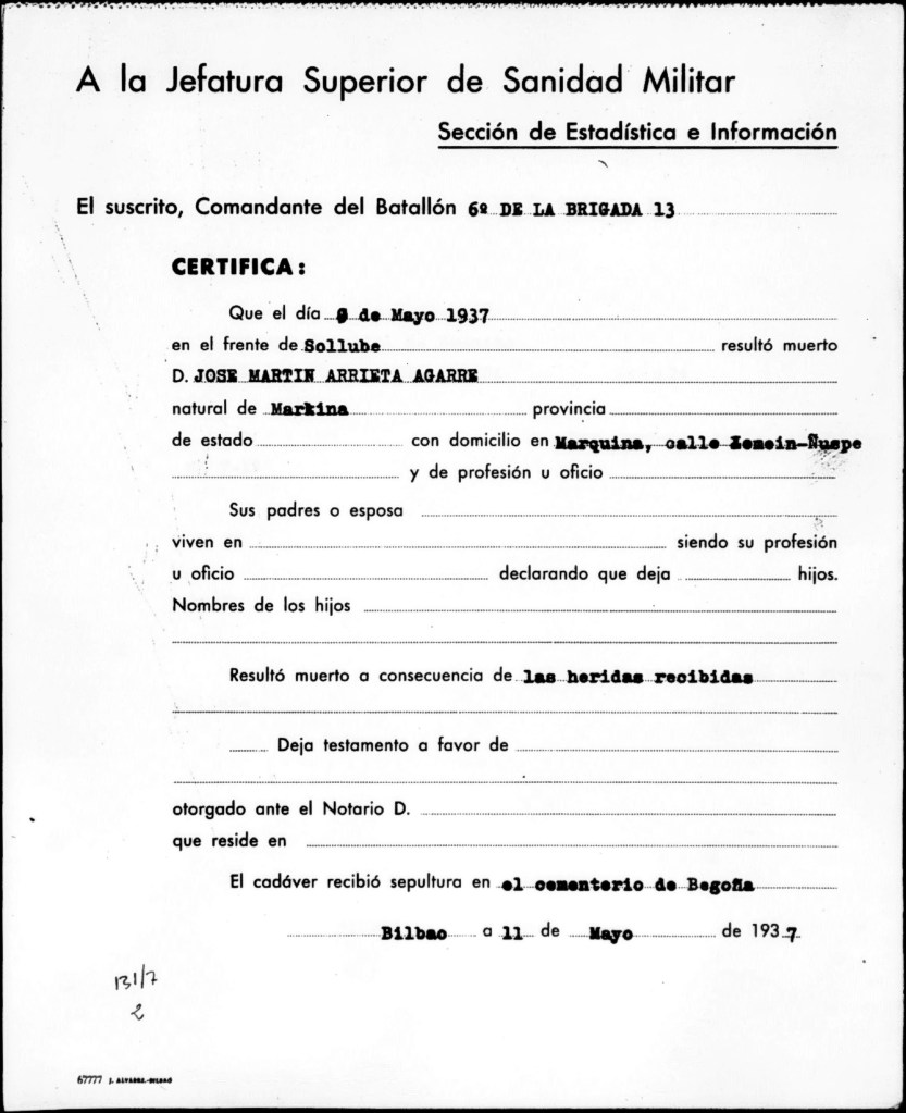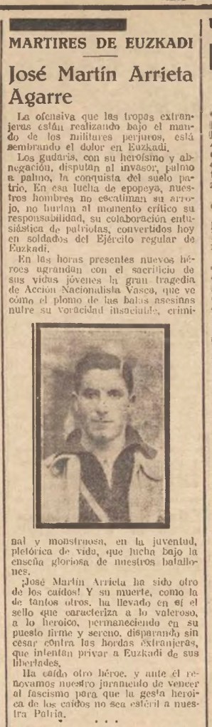 Jose Martin Arrieta Ikaran, Iñuspen baserrian (Xemein) jaio zen, 1915/11/10ean eta Sollubeko defentsan zauritu ondoren 1937/05/09an Basurtoko (Bilbo) ospitalean hil zen