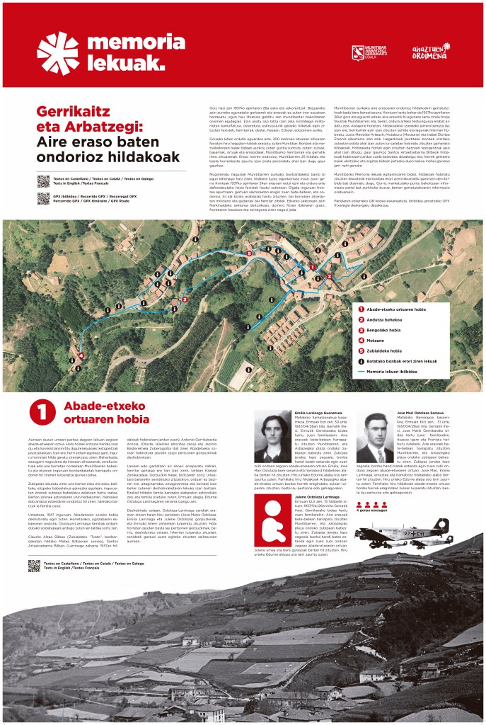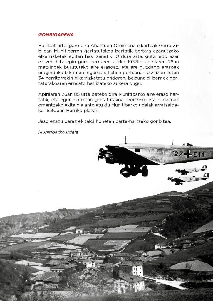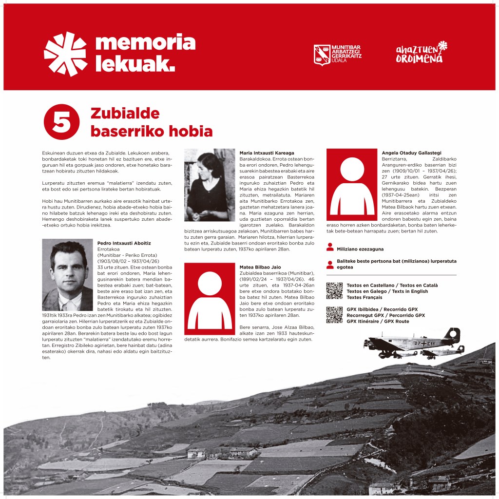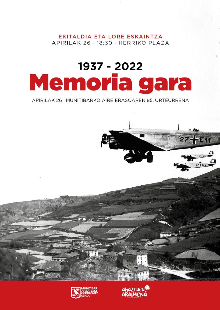 Munitibarko jaien barruan Memoria Lekuak aurkeztu dugu, 1937-04-26ko Arbazegi eta Gerrikaitzen aurkako aire erasoaren inguruko gertakariak biltzen dituen bost informazio panel, memoria ibilbidea eta liburuxka biltzen dituen ekimena. Komunikazioa Munitibarko Udala rekin batera, memoria osoa, memoria kolektiboa eraiki eta aire eraso hark utzitako biktimen duintasuna bere lekuan jartzen lagundu nahi duen ekimena