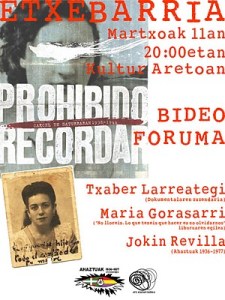 Txaber Larreategiren Ā«Prohibido recordarĀ» dokumentala ikusgai izan zen ondoren. Saturrarango kartzelan egondako emakumeen testigantzekin egindako dokumental bizi eta hunkigarria. Bukaeran, Txaberrek eta Maria Gorasarrik beraien ikuspuntua eta balorazioa helarazi zuten han bildutako guztien aurrean. Maria Gorosarrik, Ā«No lloreis, lo que teneis que hacer es no olvidarnosĀ» liburuaren ikuspegi paregabea agertu zuen: Autoritarismoa erabiliz, faxistek āgaraituen botereakā genero ikuspegitik emakumeenganako eragin zien zapalkuntza.