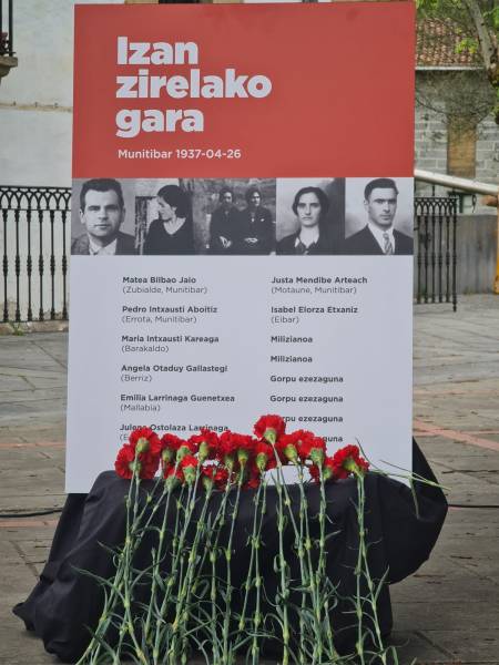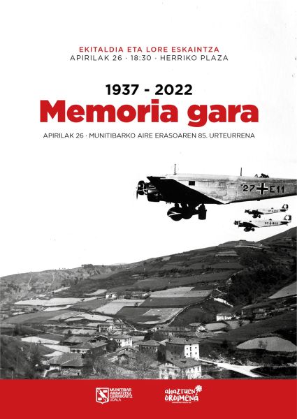 Gaurko eitaldian, Memoria osoa aldarrikatu dugu, Munitibarko udalarekin batera. 1937-04-26 goizean Arbatzegi eta Gerrikaitzen aurka faxistek burututako aire erasoaren 85.urteurrenean. 25 hildako eta beste horrenbeste zauritu izendatu ahal izan ditugu gaur gaurkoz. Ekitaldi honekin haien oroimenean zor diegun justizia aldarrikatu dugu erreparazioaren bidean lore eskaintza eta aitortza eginez. Haietako zenbait herritarrak ziren, beste batzuk errefuxiatuak, erretiradan zihosxen gudari eta milizianoak besteak. Zenbait hildako, ortuetan hobiratu zituzten hobi komunetan; Memoria Lekuak izango dira pertsona haien duintasunari abegikor.
